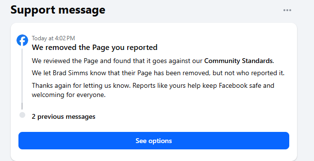 Then shortly after, it started grabbing any BMX Name it could and well, posting a RIP for them The one that caught my eye was "for Bob Haro who I am happy to report is very much alive. Facebook has pretty lean rules on profiles and what they post, UNLESS it’s something like “Abuse” or what I used, “Mis-Information” This profile had posted several RIP pictures of people in the BMX World that were very much alive… With that I reported the profile. I recently got a message from Facebook that they took action and took the Brad Simm’s Page down (Below)